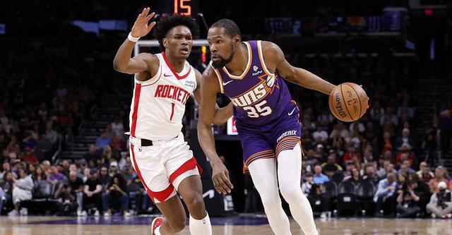 上赛季,杜兰特在太阳场均得到26.6分、6.0个篮板和4.2次助攻,投篮命中率高达52.7%,三分命中率43.0%,罚球命中率83.9%。