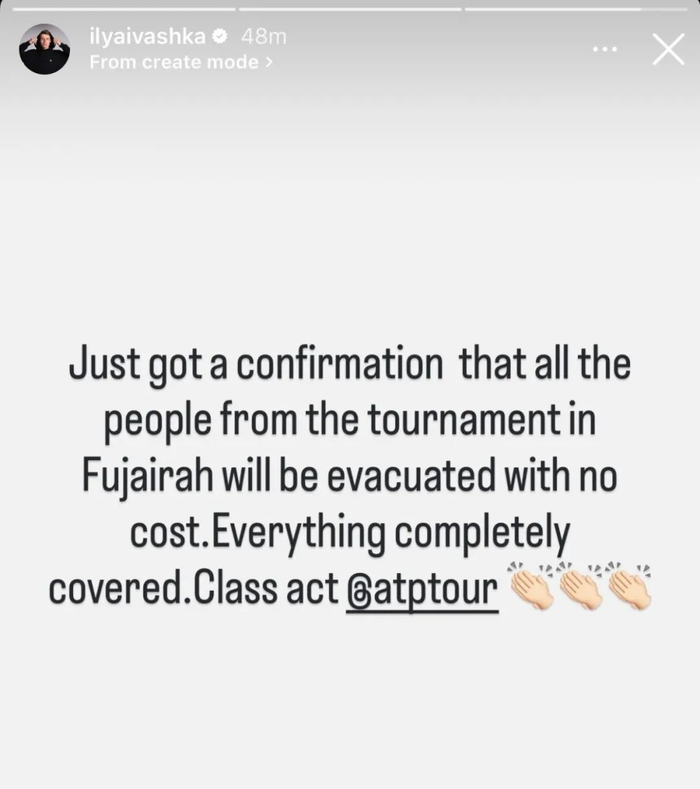 赛事取消后,如何安全疏散滞留当地的球员成为当务之急,两位中国球员孙发京和周意也在其中,孙发京在其个人社交媒体更新动态,戏称自己为“战地运动员”。参赛选手伊瓦什卡在社交媒体上透露,ATP正协调安排包机协助所有人员撤离,计划于3月5日(周四)从马斯喀特起飞,经停埃及后飞往米兰。然而,每位需要乘坐该航班的人员需要承担高达5000欧元(约4万人民币)的包机费用。