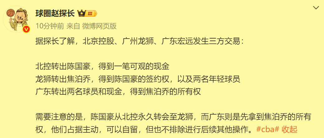 据悉,继去年休赛期辽篮的郭艾伦、南京同曦队的王岚嵚和广州队的祝铭震完成三方交易之后,又一笔三方交易正式曝光了。此次参与交易的三方分别是广东宏远队、北控队和广州队。